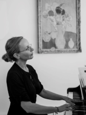 Eva Glasmacher unterrichtet auch Gesang. In ihrem ganzheitlichen Konzept arbeitet sie an Körperhaltung, Atem und Resonanz und experimentiert mit Klang und Ausdruck. Sie bezieht Elemente aus der Bewegungssprache des Gaga Movement mit ein.