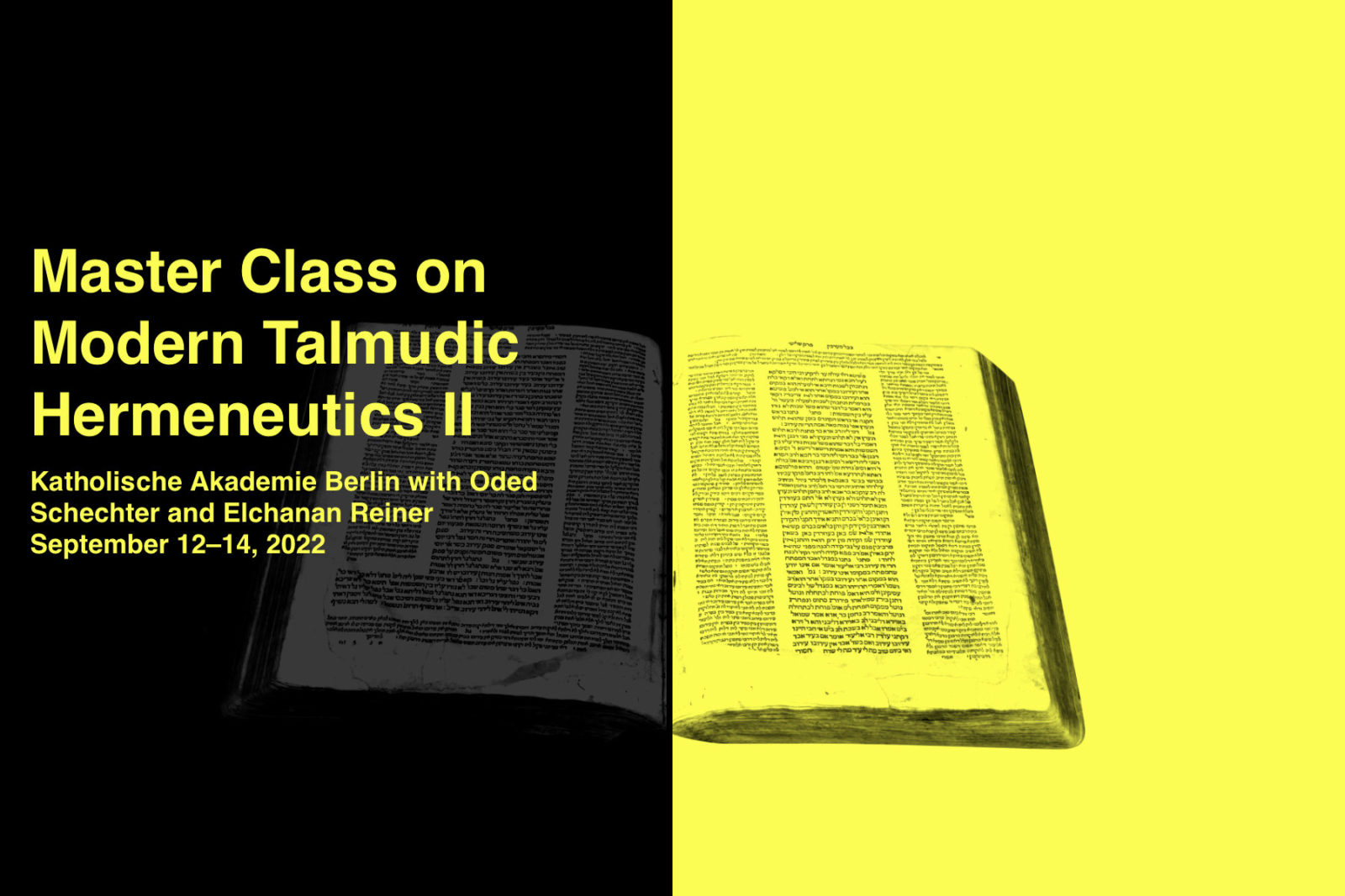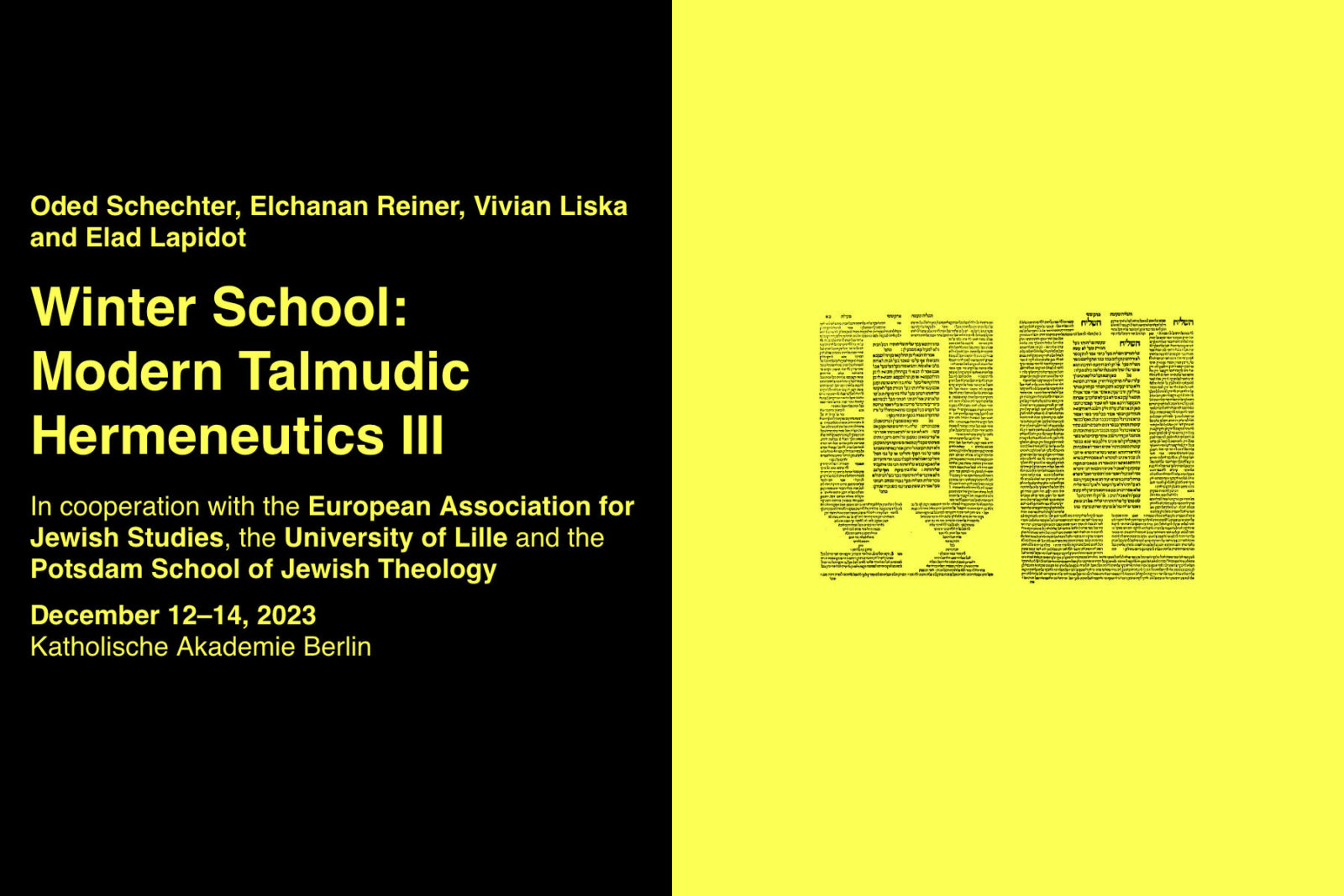 The project consists in three annual events that revolve around texts from the classical as well as from modern and contemporary Talmudic tradition: (1) a text workshop for scholars working on contemporary theory and thought, both in Talmud and in non-Talmudic traditions, which will take place in various locations with historical significance for the Talmudic intellectual tradition in cooperation with local partners (Venice, Paris, Vilnius); (2) a conference for academic and non-academic participants at the Katholische Akademie Berlin; (3) a master class for graduate students on modern and contemporary rabbinic hermeneutics, at the Katholische Akademie and other related institutions in Berlin.